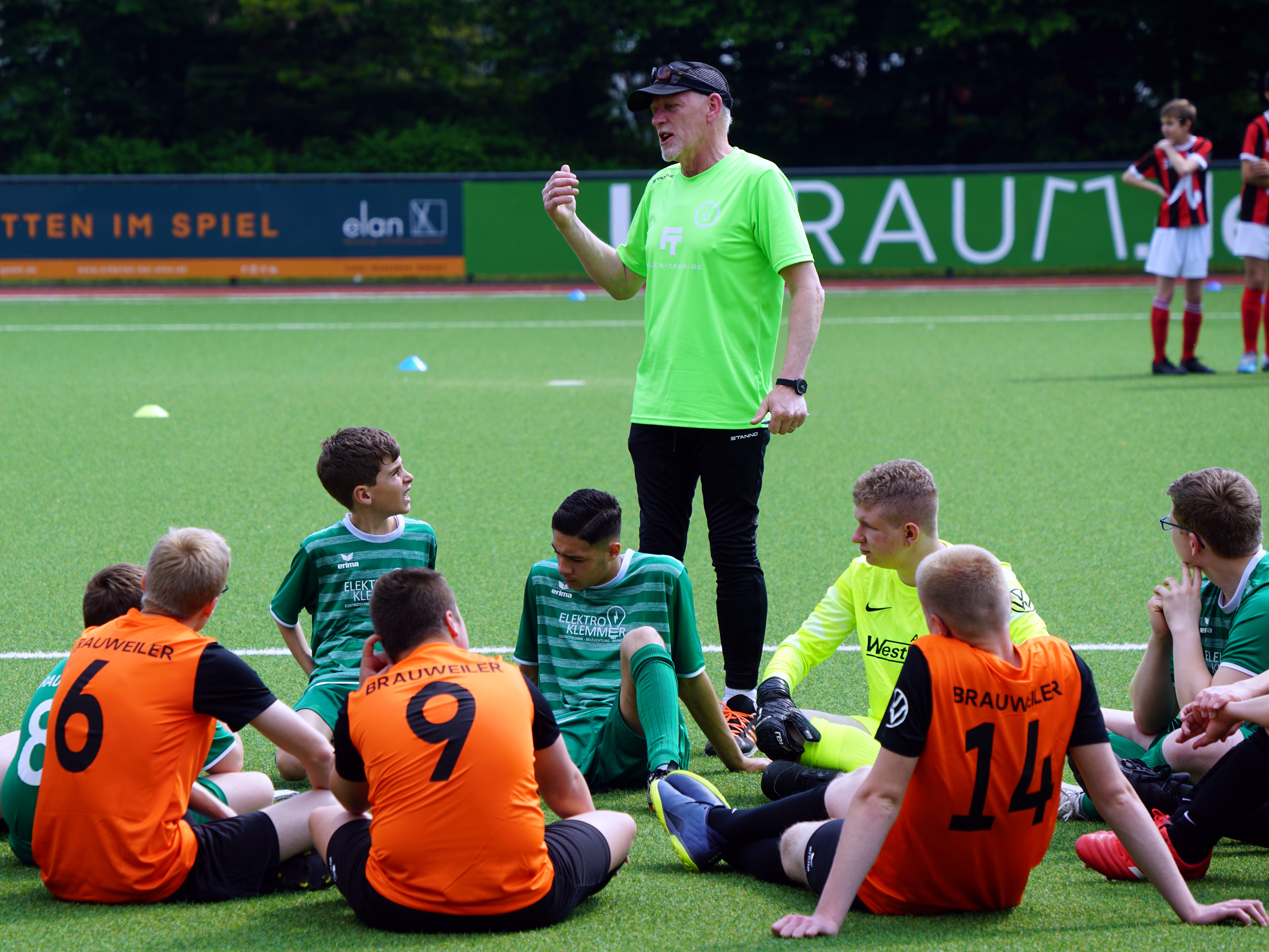 Seit dem ersten Gründungstreffen vor zehn Jahren ist viel geschehen in Sachen integrativem und grün-weißem Fußball in Brauweiler. Grün-Weiß Brauweiler wurde für sein Engagement mit dem Sepp-Herberger-Preis ausgezeichnet und neben der ursprünglichen Handicap-Mannschaft kickt mit den U13-Mini-Dragons bereits das zweite Team für unseren Verein. Immer mittendrin im Spielgeschehen: Trainer Francis Billard, der die Mannschaft mit viel Verve und Leidenschaft trainiert, was bei seinen Spielern nachhaltigen Eindruck hinterlässt. So konnte Dennis Berk als sportlicher Leiter vor dem ersten Spiel am Samstag gleich zwei aktive Spieler aus dem grün-weißen Handicap-Team zu deren bestandener Trainer-Ausbildung zum DFB-Junior-Coach gratulieren. Mimoun Chourak und Nils Ender (Foto) absolvierten den offiziellen Trainer-Lehrgang mit Erfolg. Die beiden Erfolgstrainer springen nun immer dann ein, wenn ihr Team Hilfe auf dem Trainingsplatz benötigt. Eine tolle Geschichte in einer tollen Geschichte!
