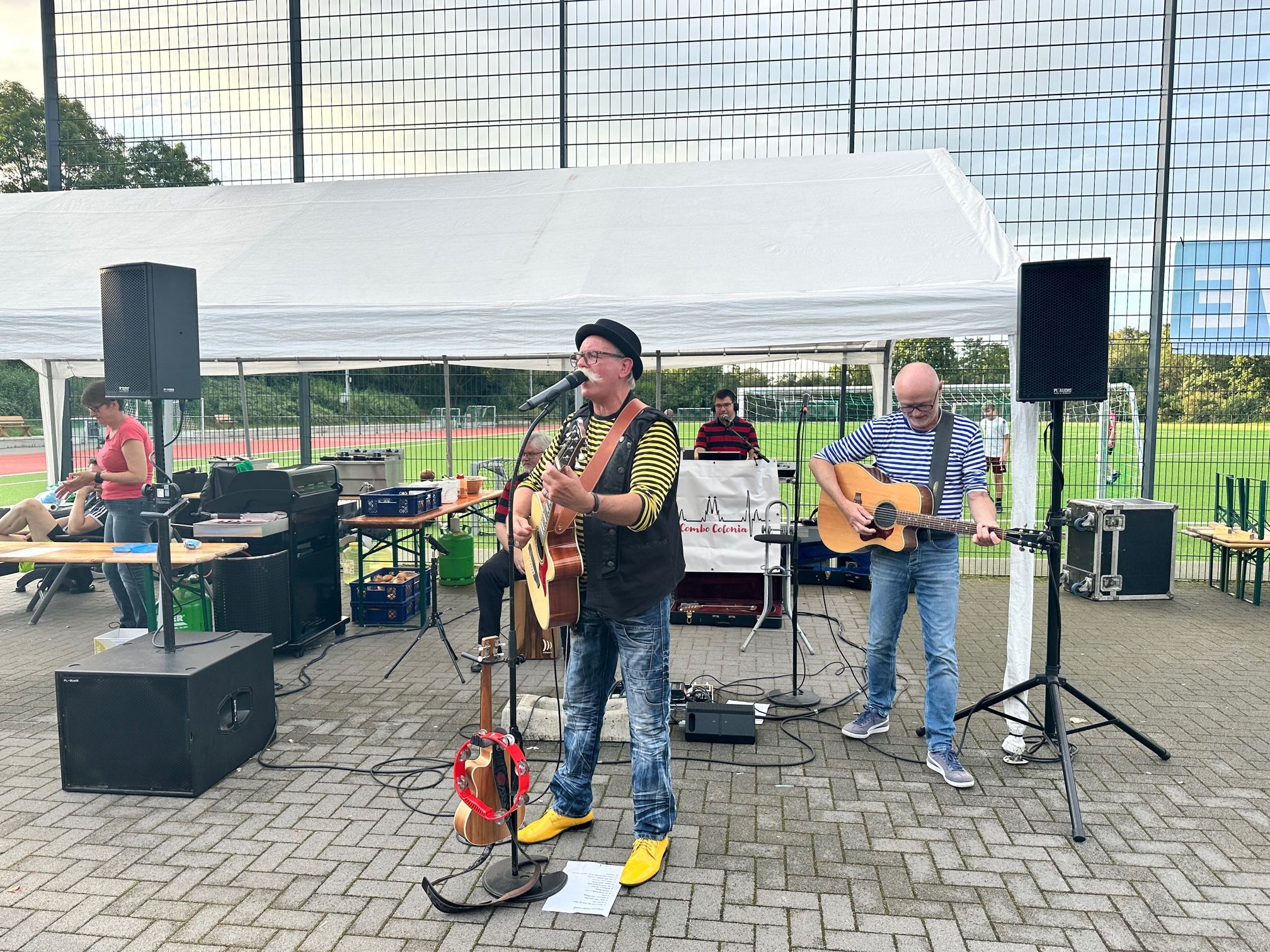 Doch damit war der Tag noch lange nicht zu Ende. Bei kalten Getränken und heißen Stadionwürsten fand der Tag seinen verdienten Ausklang – und das mit bester kölschen Musik. Denn die wunderbare „Combo Colonia“ betrat gegen 19:30 Uhr den Rasen und spielte ein buntes Potpourri an kölscher Musik, die den leider nur noch wenigen verbliebenen Zuhörern einen wunderbaren Ausklang eines langen Tages bescherte. Die immer wieder kehrenden Regenschauer, die nicht nur einmal an diesem wunderbaren Vereinstag verflucht wurden, hatten eine größere Mitsinger-Team offenbar leider verhindert. Der Stimmung tat das aber trotzdem keinen Abbruch.